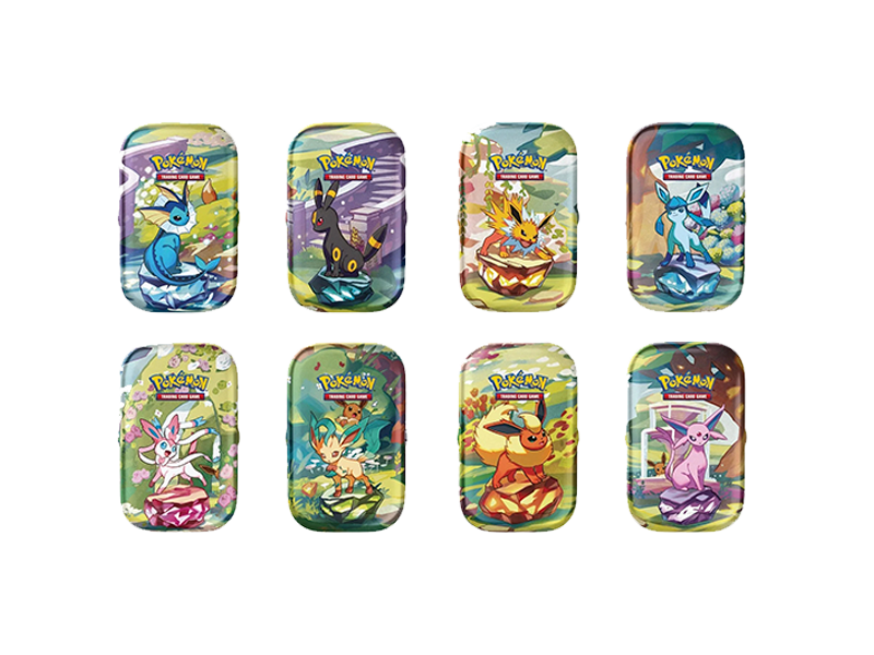 Incluye dos paquetes de mejora de Escarlata y Púrpura-Evoluciones Prismáticas; una carta con ilustraciones de Vaporeon, Jolteon, Flareon, Umbreon, Leafeon, Glaceon, Sylveon o Espeon (reproduciendo la imagen de la lata), y una moneda inspirada en Eevee.
